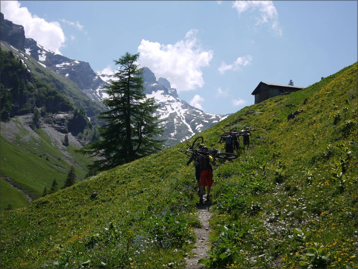 Cette descente comporte quelques passages bien techniques, voire assez scabreux, mais ils sont courts et il est toujours possible de les éviter à pied...