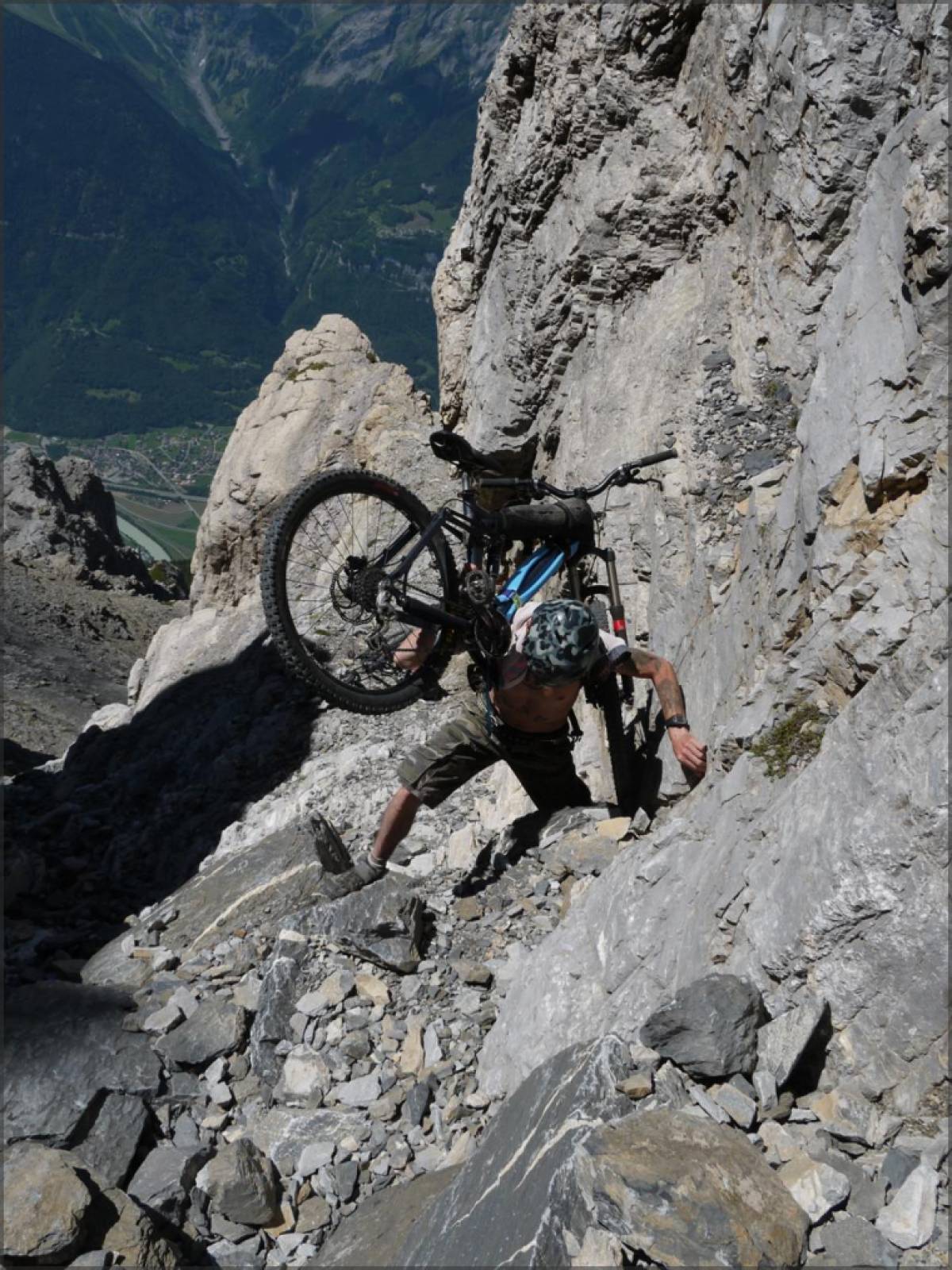Au départ du parking de la Tourche, on commence par une montée régulière jusqu'à Riondaz, comptez environ 1h de pédalage. De là, on commence la marche d'approche pour atteindre le sommet de la Dent de Morcles. Ce portage dure au minimum 3h, il est exténuant, très dangereux et il est impossible de rebrousser chemin une fois commencé! Une cheminée et un long goulet se trouvent le long du portage et demandent les efforts conjoints de 3 personnes pour passer sans encombre.
