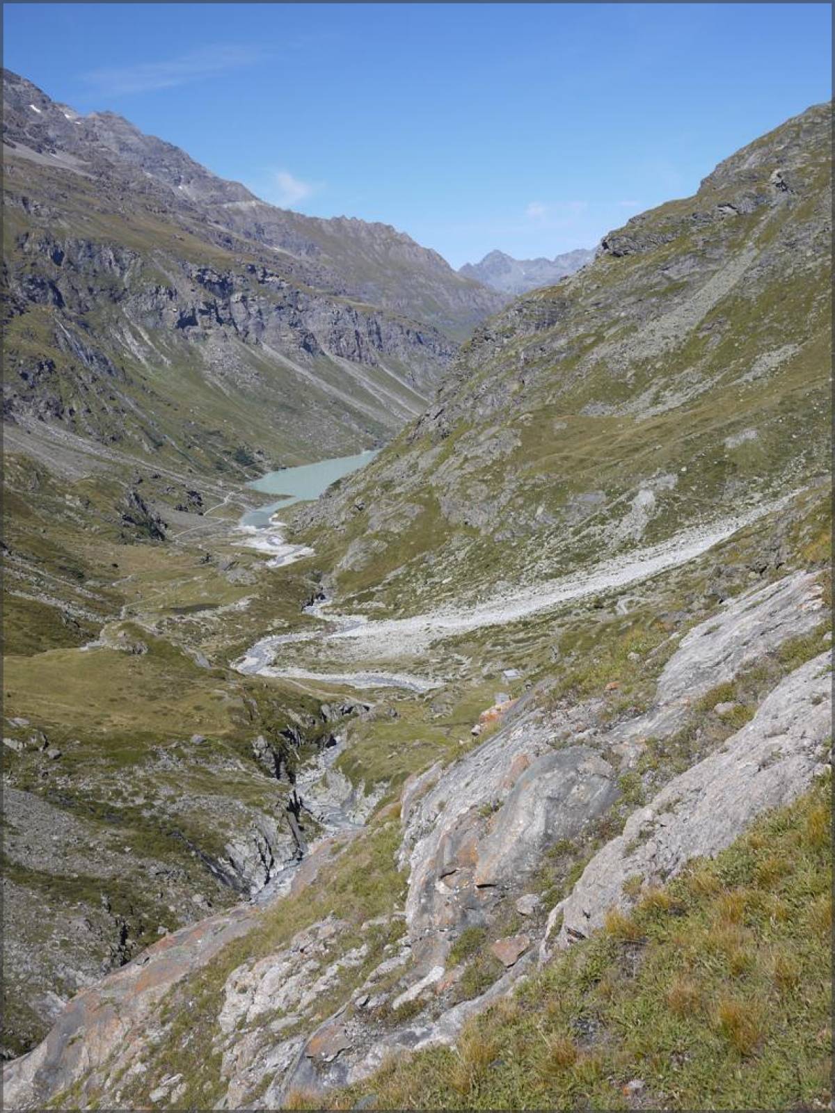 De Fionnay, on monte par la route jusqu'au barrage de Mauvoisin, que l'on longera alors sur sa rive droite (vue depuis le barrage...) pour atteindre le fond du Val de Bagnes.