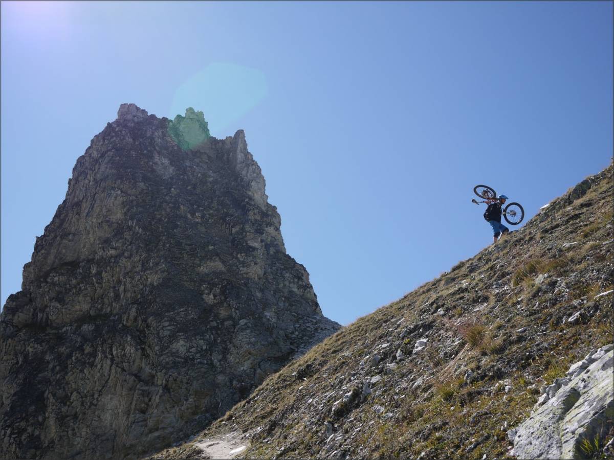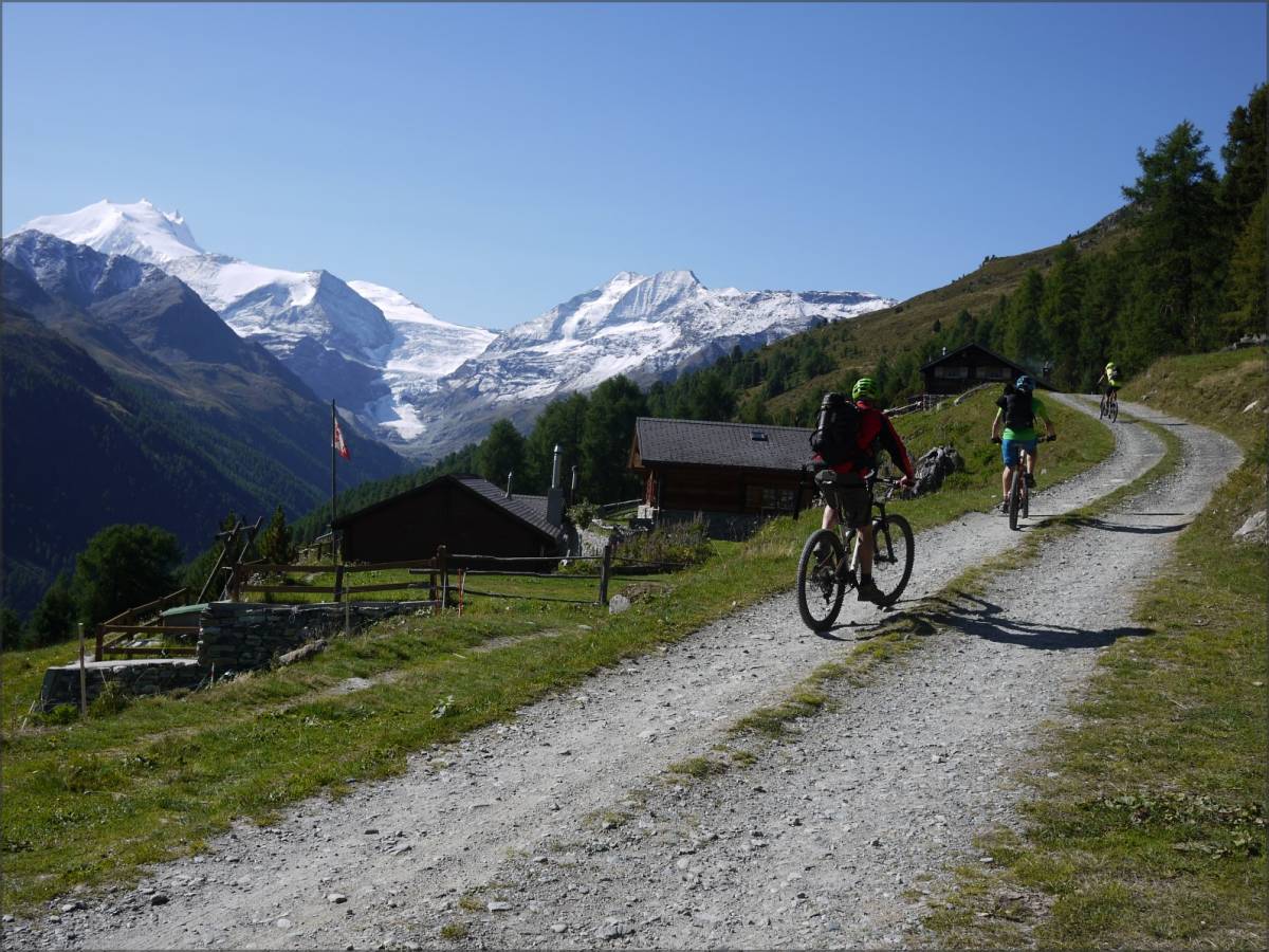 On présente ici une variante opposée à la classique traversée Est-Ouest Val d'Anniviers-Turtmanntal puisqu'on emprunte le Meidpass en sens inverse. La parcours débute à Oberems, que l'on atteint aisément par la cabine qui part de Turtmann (les plus motivés pourront toujours grimper à la pédale...). Commence alors la longue ascension vers le Meidpass. D'abord, pour se chauffer la moindre, sur bitume jusqu'à Rotigu Unnerstafel, puis sur une large piste jusqu'à Meide Oberstafel. Les choses sérieuses commencent alors sur le sentier qui grimpe au très joli Meidsee et qui continue jusqu'au Meidpass. Il y a du portage, mais le jeu en vaut la chandelle ! Et puis le panorama sur le Weisshorn vous fera facilement oublier les efforts consentis !
